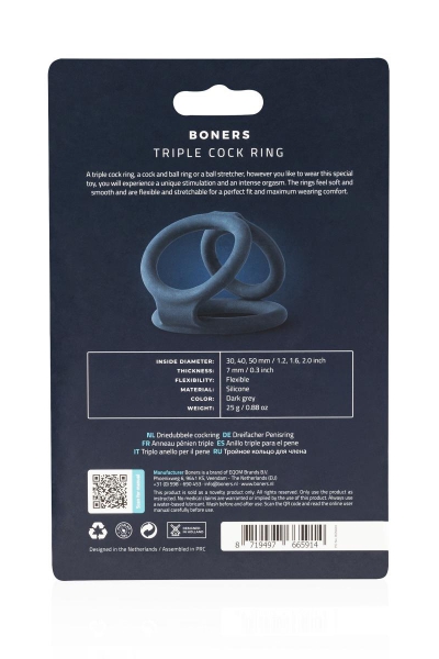 La marque Boners présente le "Triple Cock Ring", un triple anneau de pénis polyvalent, en silicone, qui met en valeur les organes génitaux.