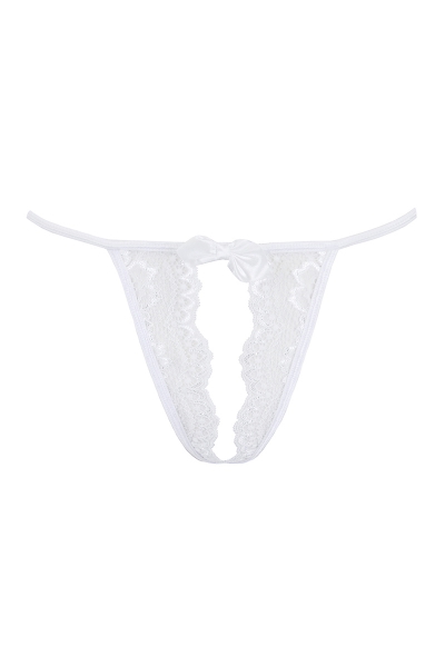 Osez la sensualité irrésistible de ce string fendu blanc immaculé en dentelle, décoré d'un noeud satin sur la ceinture.